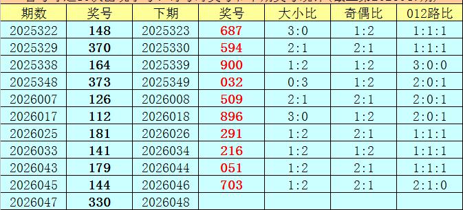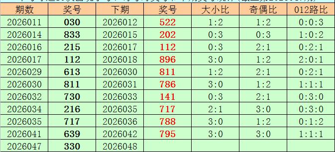 开奖回顾:体彩排列三第2026047期开出奖号330,奖号大小比开出0:3,奇偶比开出2:1,012路比开出3:0:0。