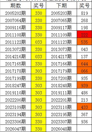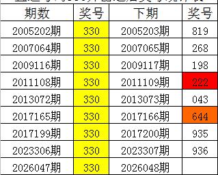 从上表统计可以看出,直选号码330开出之后,其下期奖号: