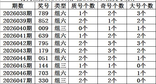 上期回顾:排列三第2026047期开奖:330,质合比为2:1,奇偶比为0:3,大小比为2:1。