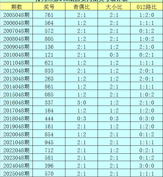 排列三第2026048期开奖日期:2026年2月27日,历史上第048期已开出了21次奖号,历年同期号码分别为:761、564、572、805、136、121、621、833、263、861、085、337、164、444、161、854、945、712、581、396、570。