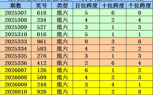 第2025333-第2025335期奖号:961、583、276,其下期奖号为:412,首位号码跨度为2;