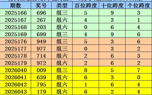 第2026040-第2026042期奖号:009、639、795,其下期奖号为:179,中位号码跨度为6;