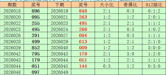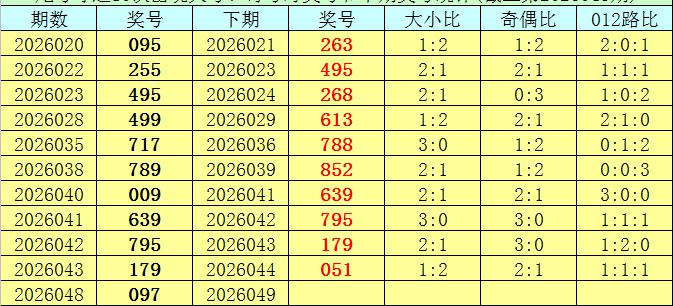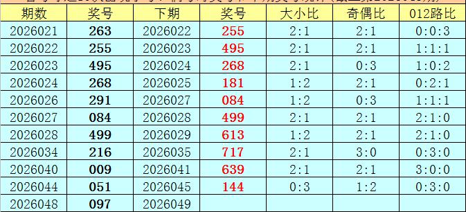 开奖回顾:体彩排列三第2026048期开出奖号097,奖号大小比开出2:1,奇偶比开出2:1,012路比开出2:1:0。