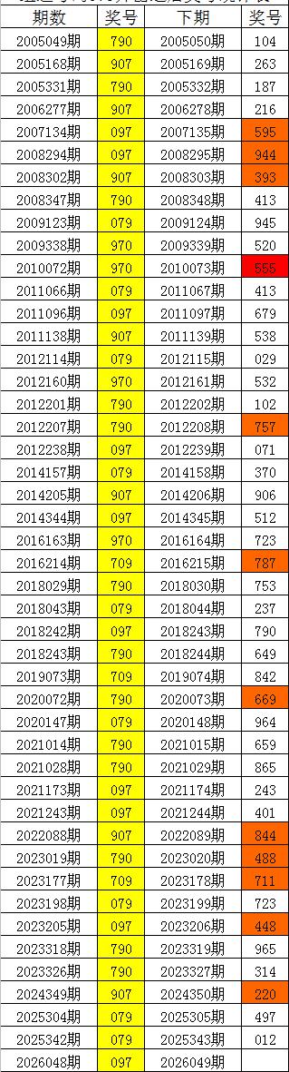 一、体彩排列三第2026048期奖号为097,该号码历史上直选出现了10次,组选出现了46次。