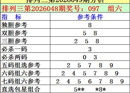 排列三26049期 独胆8,双胆58,杀一码3