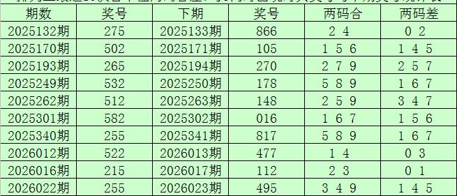 排列三第2026050期奖号两码合差分析: