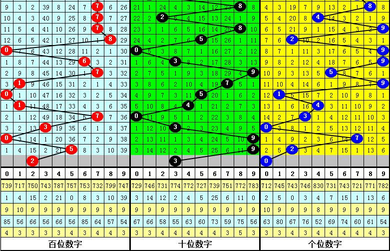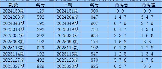 百个位合差分析:上期奖号百个位开出52组合,两码合为7,两码差为3,最近10次百个位两码合7与两码差3同时出现时,其奖号和下期奖号分别为: