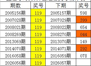 体彩排列三组选号码119历史上出现了19次,其下期奖号分别为:598、399、654、044、663、898、149、666、292、078、116、141、882、880、573、114、195、233,详细统计见下表: