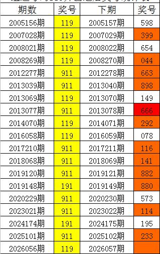 一、体彩排列三第2026056期奖号为119,该号码历史上直选出现了8次,组选出现了19次。