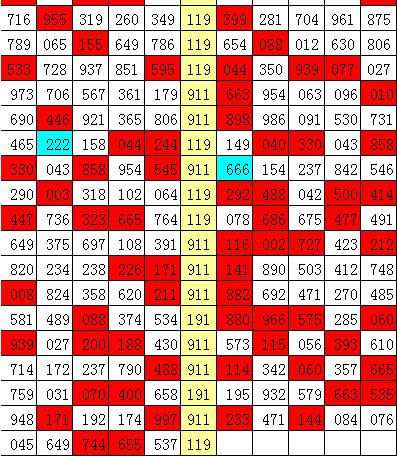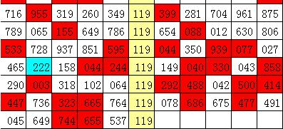 在以上统计表中,组选号码119开出之后,其下期豹子号码出现1次,组三号码出现11次,组六号码出现6次。其中,下期奖号有9期无重号,有9期开出重号,本期预计重号开出,看好开出组六号码。