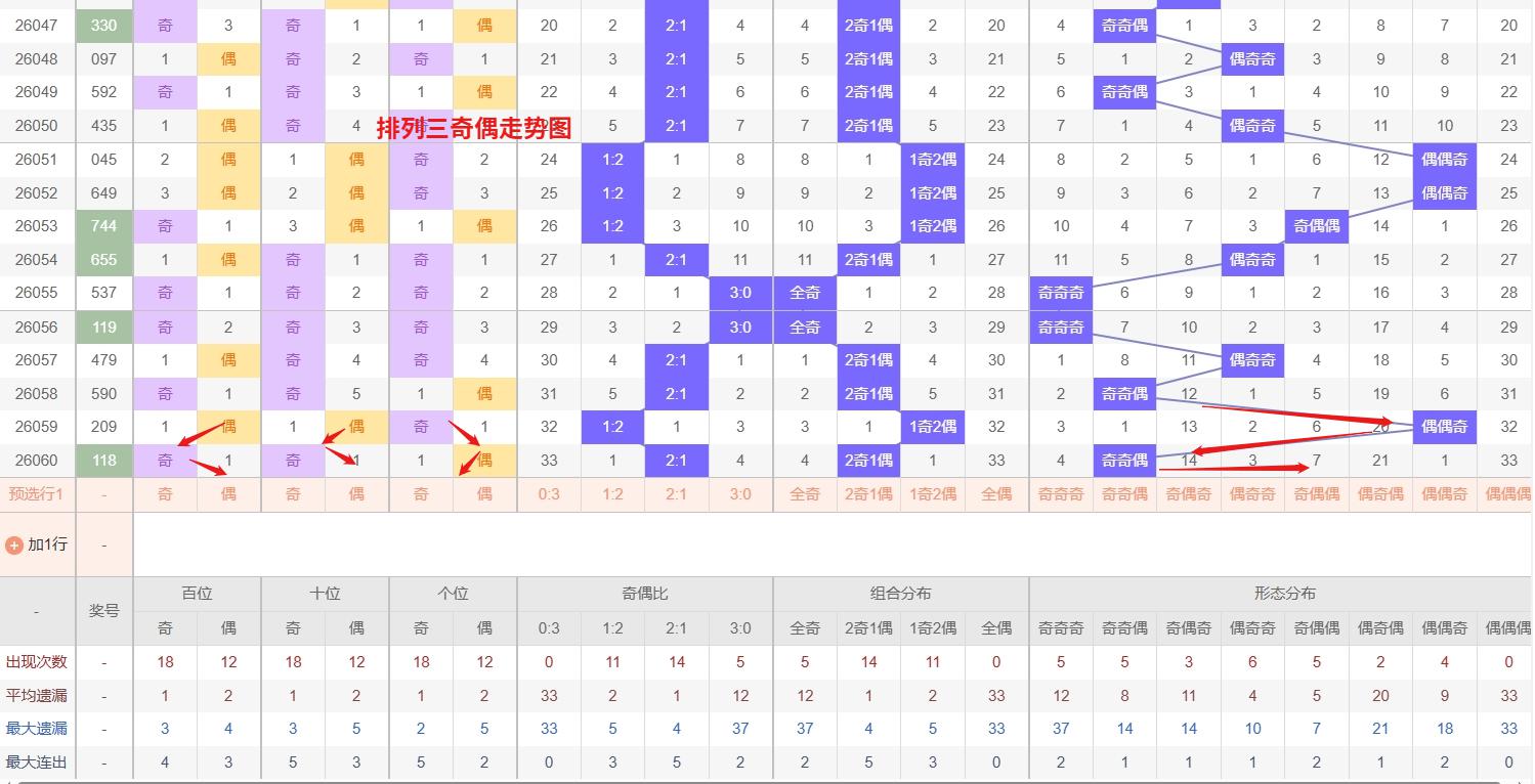 排列三 奇偶分析:从上图可以看出排列三100期内百位奇偶比约为52比48,十位奇偶比为53比47,个位奇偶比为55比45,百位的比值比较均衡,但是个位的比值偏差就有点大,历史奇偶形态近2期开出奇奇偶后下一期的走势为,第332期开出奇奇偶后333期开奇偶偶, 第342期开出奇奇偶后第343期开偶奇偶,第015期开出奇奇偶后第016期开奇偶奇,近期排列三奇偶形态的走势来看,“奇偶偶”组合作为热号表现极为活跃,不仅连开频率高,而且多以隔期回补的形式展现,这种热度背后反映出当前个位与十位对偶数的偏好较为稳定,惯性较强,下一期该形态连下的概率依然较大,值得重点关注;与此同时,“偶奇偶”作为冷态组合已遗漏多时,远超其理论出现周期,进入了典型的回补窗口期,从概率补偿角度分析,这种深度冷号往往在热号轮动间隙突然杀出,容易形成意想不到的变局。所以排列三2026061期奇偶形态推奇偶偶与偶奇偶。本文由为彩网钱是生命动力所著,请勿转载