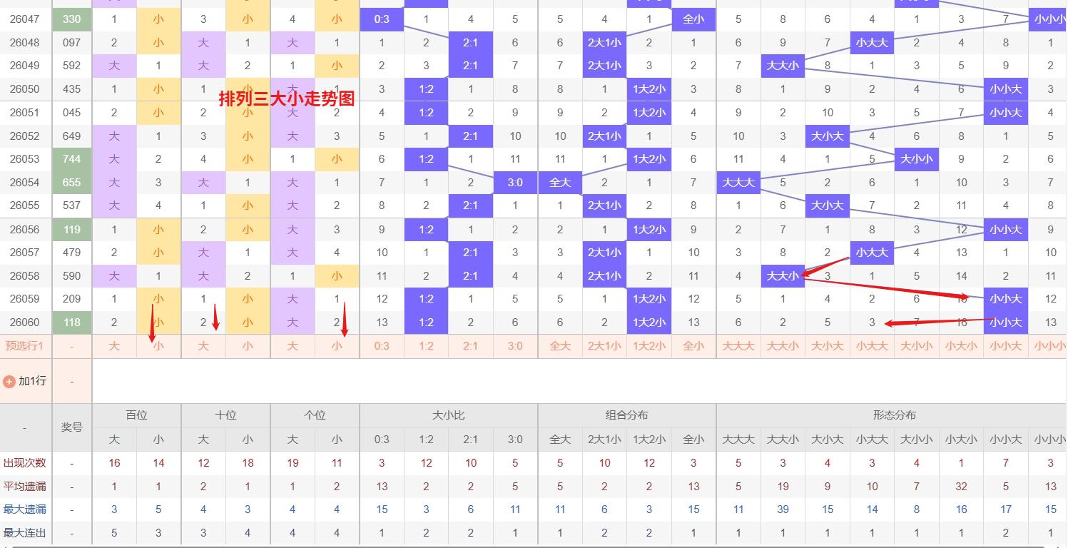 排列三 大小形态分析:从大小走势图上可以看出排列三100期内百位大小比约为55比45,十位大小比约为48:52,个位大小比约为54比46,除了个位和百位奇数比偶数多,十位偶数比奇数多。历史数据近2期开出小小大下一期的走势为,第324期开小小大后第325期开大小大。第347期开出小小大后第338期开小大小,第008期开出小小大后009期开小小小。近期排列三大小形态的走势来看,“大小大”组合作为热号近期表现尤为活跃,无论是连开还是隔期回补的频率都相当高,这种热度反映出当前百位与个位对大号的偏好较为集中,形成了明显的惯性趋势,下一期该形态连下的概率依然较大,值得重点关注;与此同时,“小大小”作为冷态组合已遗漏多时,远超其理论出现周期,进入了典型的回补窗口期,从概率补偿角度分析,这种深度冷号往往在热号轮动间隙突然杀出,一旦反弹容易形成意想不到的变局。因此,在接下来的选号中,以热态“大小大”为防守核心,积极跟进其连下趋势,所以排列三第2026061期大小形态推荐大小大防小大小。本文由为彩网钱是生命动力所著,请勿转载