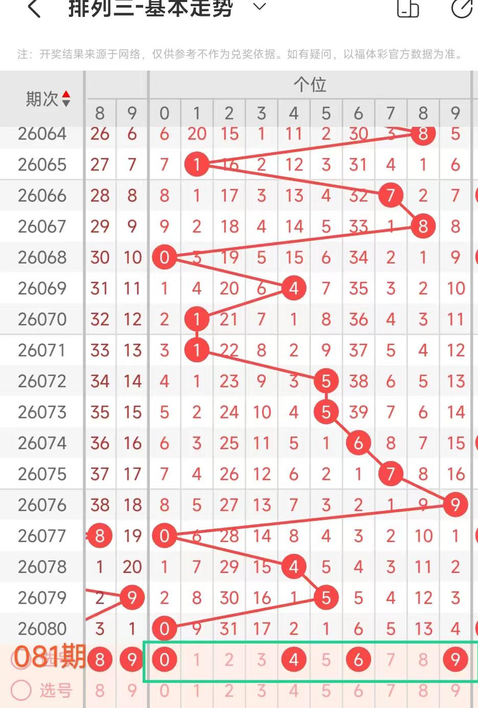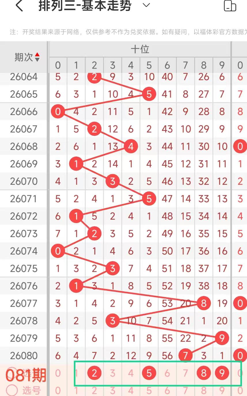 经统计0号出现5次、1号出现5次、2号出现8次、3号出现4次、4号出现8次、5号出4次、6号出现5次、7号出4次、8号出现8次、9号出现8次.统计后出现次数靠前的数字作为我们的备选号码.其号码有2489等