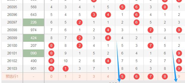 上图是体彩排列三开奖号码走势分布图,我标注出来的蓝色箭头中间的数字5678连续三期没出现号码,最近5期也只开出了一个数字,那么本期这个区域的数字可以关注出1个或者2个。