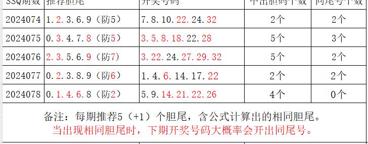 分享第三个数据分析:定胆尾。每期计算出5个推荐胆尾,1个重点防胆尾(会员专区可见)。以近5期推荐胆尾的统计数据为例: