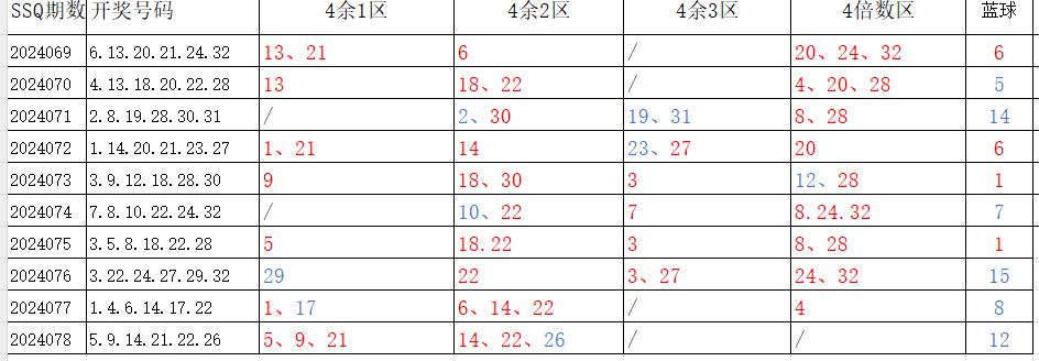 首先看上期回顾,双色球24078期开奖结果:5.9.14.21.22.26+12。其中红球开出4余1区号码3个,4余2区号码3个,4余3区、4倍数区遗漏未出。蓝球接连3期开出冷号。再看上期个人分析:推荐胆尾中出4个,红球杀号6中5,蓝球杀号8中7,推荐大底中出4+0!恭喜中出的朋友!