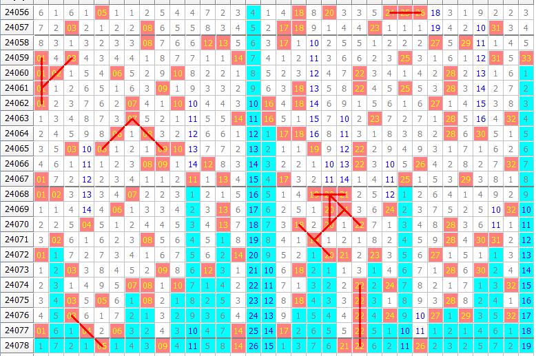 上图红框数字为开奖号码,其它数字为号码的遗漏值(离上次开出间隔的期数),比如上图中号码01的遗漏值为1,号码02的遗漏值为7,号码03的遗漏值为2.....)。