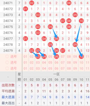 根据走势图可以看出当区段,072期开出了01一个号码球,073期开出了03.09二个号码球,074期开出了07.0810三个号码球,075期开出了03.05.08三个号码球,076期开出了03一个号码球,077期开出了01.04.06三个号码球,078期开出了05.09二个号码球,079期开出了02.03.06.07四个号码球,按照如此规律本期当前区基本不会开出超过两个号码。我们看下当前区上期没有开出重叠号,那么本期当前区重叠号可以预测保留在一个范围之内。再看下当前区段上期开出06斜连号,当期选号得留意斜连号。建议连号关注03.04