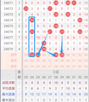 根据走势图可以看出当前区,072期开出了23.27二个号码球,073期开出了28.30二个号码球,074期开出了24.32二个号码球,075期开出了28一个号码球,076期开出了24.27.29.32四个号码球,077期没有开出号码球,078期开出了26一个号码球,079期开出了26一个号码球,按照如此规律本期当前区可能开出一到两个。我们看下当前区上期开出26重叠号,那么本期当前区重叠号有可能会出现。再看下当前区上期没有开出斜连号,当期选号得留意斜连号。