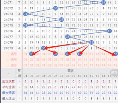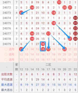 根据走势图可以看出当前区段,072期开出了14.20.21三个号码球,073期开出了12.18二个号码球,074期开出了22一个号码球,075期开出了18.22二个号码球,076期开出了22一个号码球,077期开出了14.17.22三个号码球,078期开出了14.21.22三个号码球,079期开出了16一个号码球,按照如此规律本期当前区基本不会开出超过三个号码。我们看下当前区上期没有开出重叠号,那么本期当前区重叠号预测保留在一个范围之内。再看下当前区上期没有开出斜连号,当期选号得留意斜连号。本区连号建议关注16.17