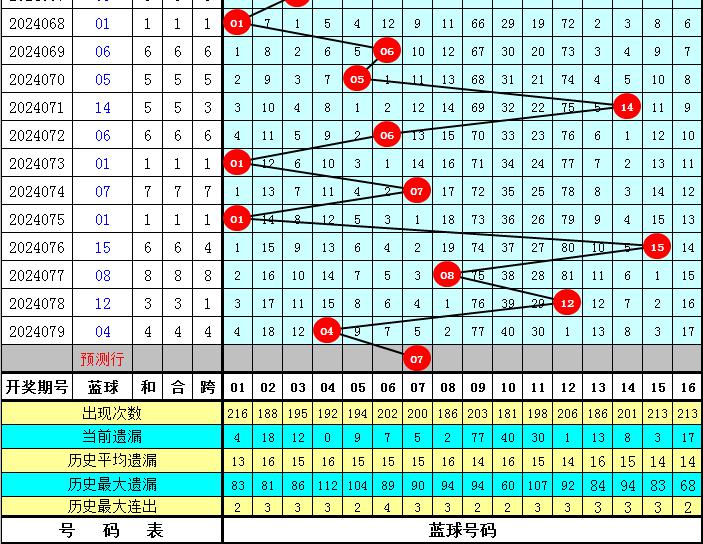 龙头分析:上周日第24077期龙头开出01,最近十周星期日龙头奇偶比为9:1,012路比为1:7:2,本期预计龙头上升,关注红球07。