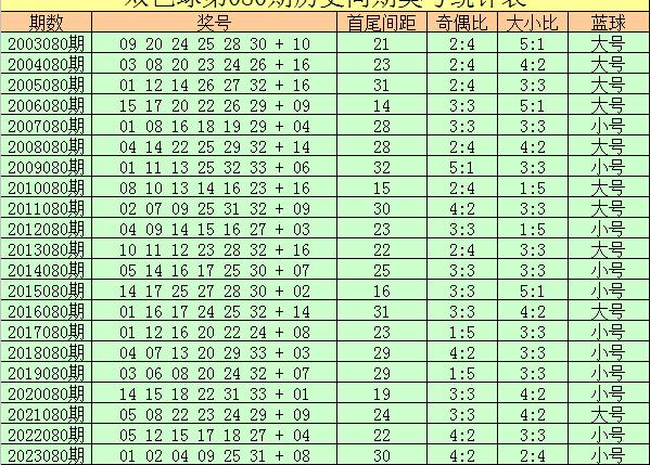 蓝球分析:在第080期历史同期开奖中,蓝球号码奇偶比为8:13,偶数蓝球表现活跃,大小比为10:11,大小蓝球开出比例基本相当,本期预计蓝球为偶数、小 号,关注蓝球号码08。