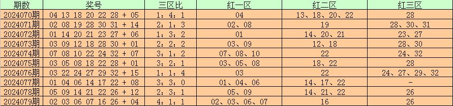 双色球第2024079期奖号为:020306071626+04,红球三区比为4:1:1。