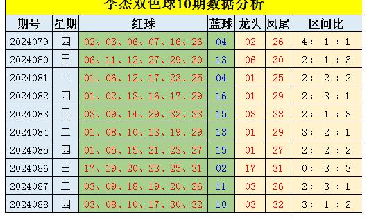 双色球第2024088期出奖号统计:红球030810173032,蓝球10,和值为100,跨度29,龙头03、凤尾32,三区比为3:1:2,012路比为2:1:3,奇偶比为2:4,大小比为3:3,冷热比为2:4,1枚重号,0组连号。