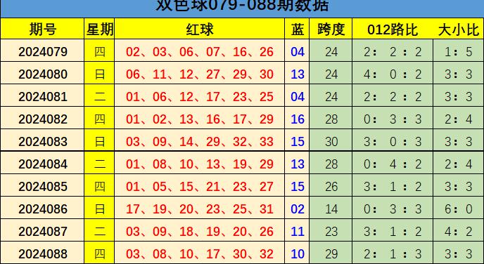 上期开出蓝球10号为大偶数,近10期大小比7:3,奇偶比5:5;综合分析,本期推荐2路大偶号码蓝球出号14。