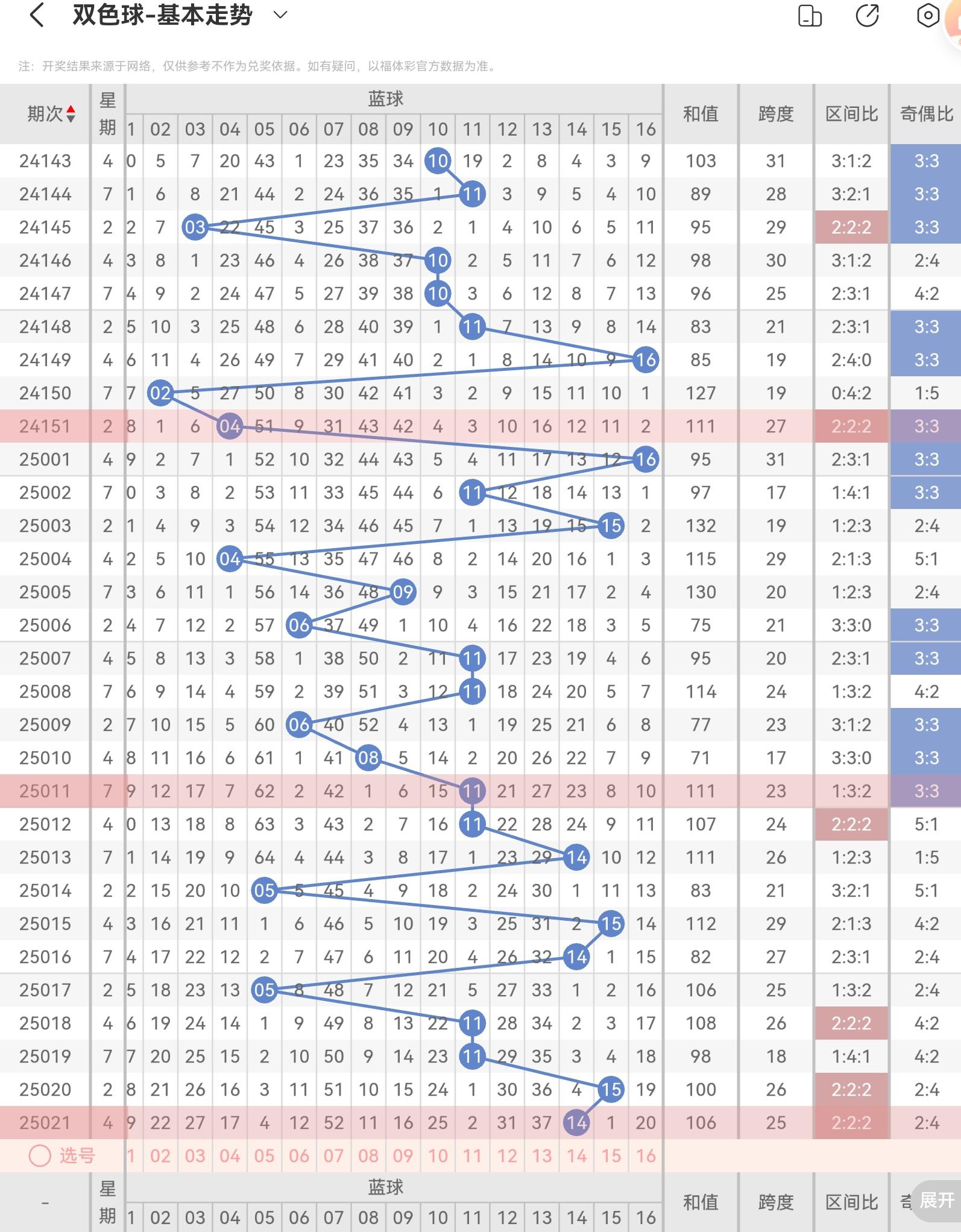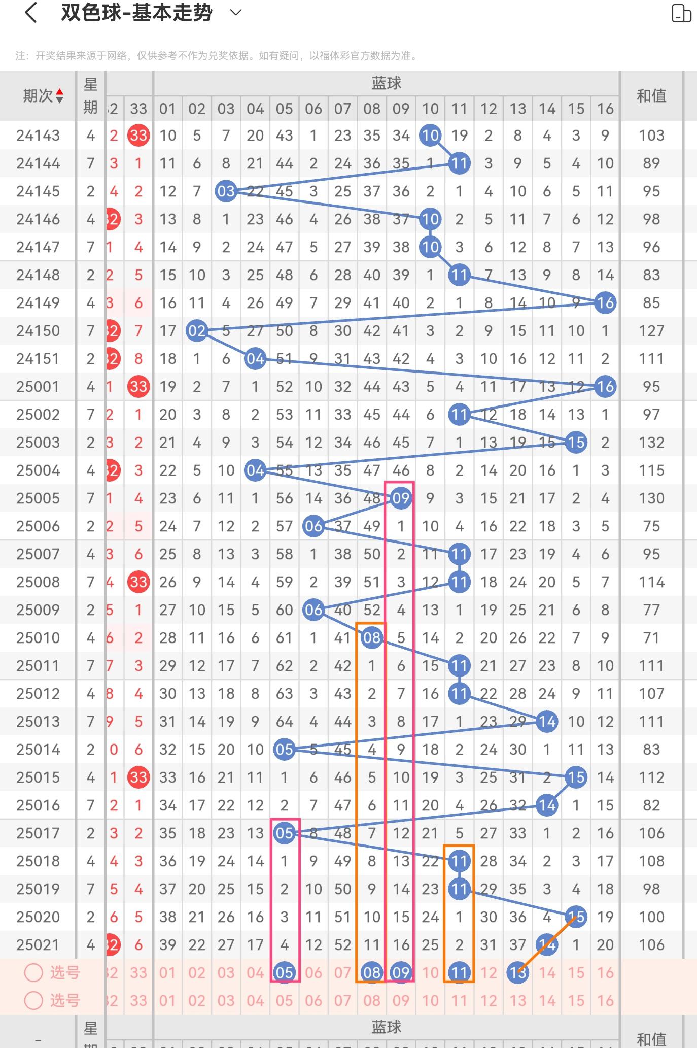 >蓝球上期(25021期)开出了14,开出了偶数号码,连续四期开出奇数号码后回补开出了偶数号码,本期需要注意是会继续开出偶数号码还是会回补开出奇数号码,且连续四期开出后端大号号码,本期需要注意是会继续开出后端大号号码还是会回补开出前端小号号码,本期蓝球首先需要关注的号码【05】四期回补号码,然后是【08】十一期回补号码,其次是【09】十六期回补号码,【11】重号两期回补号码,【13】三斜连走势号码,本期蓝球重点关注号码【05 08 09 11 13】