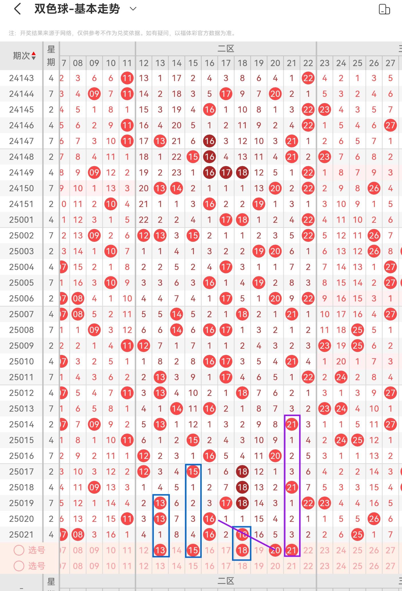 >二区间上期(25021期)开出了两码16-18,开出了重号和独码,本期做号需要注意重号能否继续开出,以及独码位置能否有落码和空白区域号码回补落码,从近期该区间上开出的重号来看,在25018期开出重号后下期重号走了重和分了边,在25019期开出重号后下期重号放了空,在25020期开出重号后下期重号放了空,本期重号位置号码需要仔细研判考虑,从近期该区间上开出的独码来看,在25017期开出独码后下期独码走了重,在25018期开出独码后下期独码分了边,在25019期开出独码后下期独码走了重,本期独码位置号码需要仔细研判考虑,本期首先需要关注的号码【13】重号隔期回补号码,然后是【15】四期回补号码,其次是【18】重号形态号码,【20】五期回补号码带隔空斜连走势,【21】三期跳空对称形态,本期重点关注号码【13 15 18 20 21】
