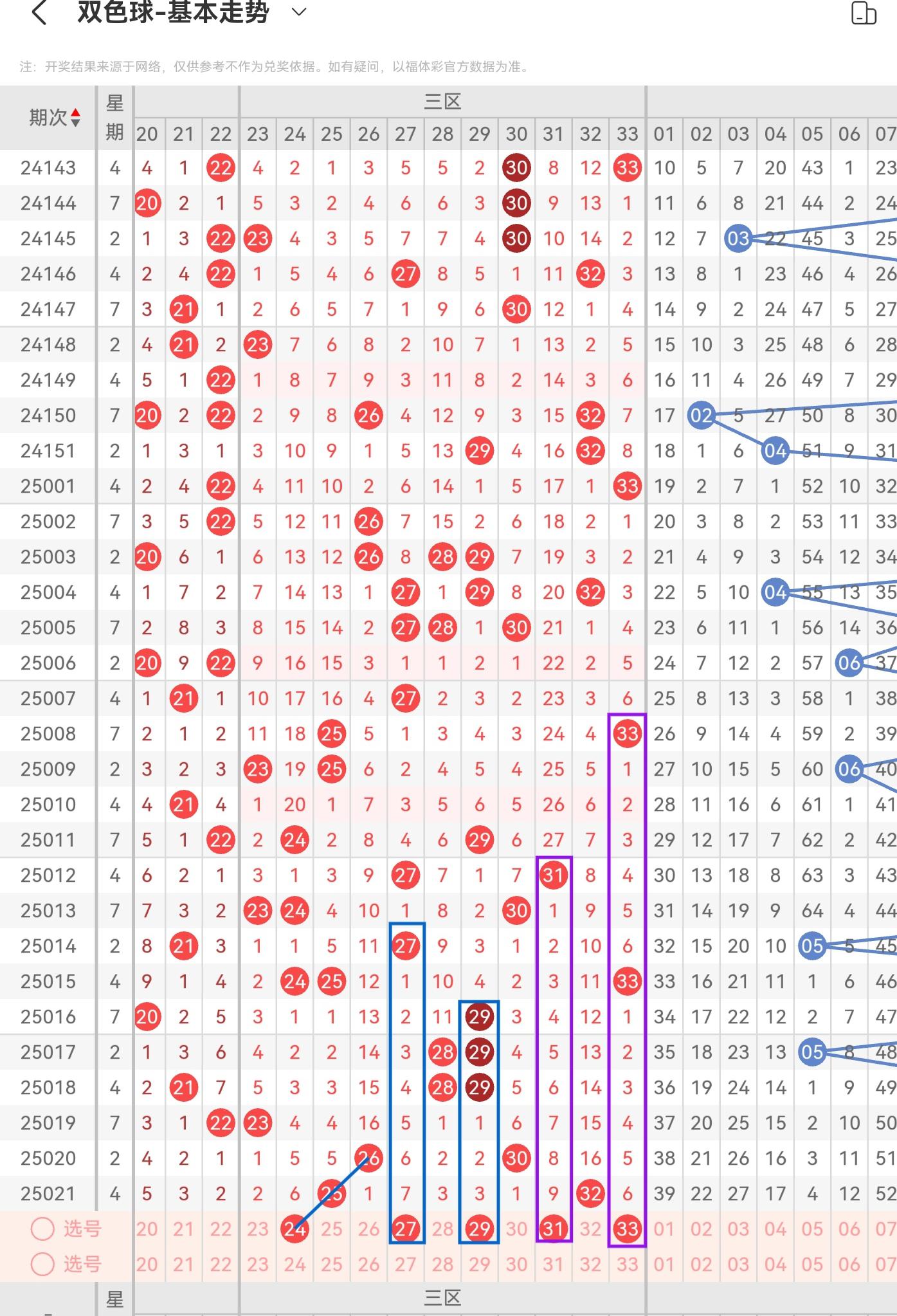 >三区间上期(25021期)开出了两码25-32,开出了分边号码和独码,本期做号需要注意斜连走势号码能否开出,以及独码位置能否有落码和空白区域号码回补落码,从近期该区间上开出独码分边形态来看,在25013期开出独码分边形态后下期放了空,在25017期开出独码分边形态后下期开出了重号,从近期该区间上开出的独码来看,在25015期开出独码后下期独码放了空,在25016期开出独码后下期独码走了重和分了边,在25020期开出独码后下期独码一个分了边,另一个放了空,本期首先需要关注的号码【24】六期回补号码带三斜连走势,然后是【27】七期回补号码,其次是【29】重号三期回补号码,【31】九期回补号码,【33】六期跳空对称形态,本期重点关注号码【24 27 29 31 33】