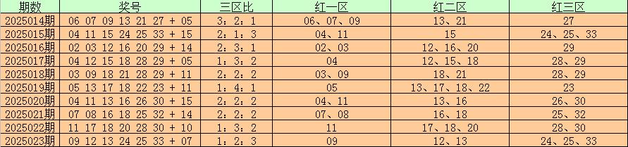 双色球第2025023期奖号为:091213242533+07,红球三区比为1:2:3。