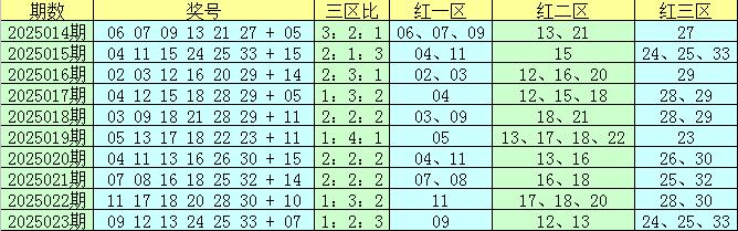 红二区(12-22):上期该区走温,开出2个红球,该区最近10期红球个数分布为:2、1、3、3、2、4、2、2、3、2,共开出24个红球,出号比例相对较高,本期看好该区再次热出,关注3个红球,红球大范围关注:12、13、14、15、16、22,红二区精选红球:12、14、15。