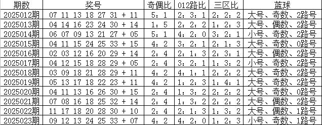 双色球第2025023期奖号为:091213242533+07,红球三区比为1:2:3,奇偶比为4:2,012路比为4:2:0,蓝球为奇数、小 号、1路号。