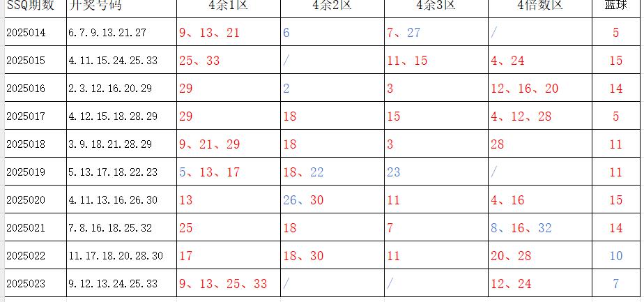 首先看上期回顾,双色球2025023期开奖结果:9.12.13.24.25.33+7。其中红球号码开出:4余1区号码4个,4余2区号0个,4余3区号码0个,4倍数区号码2个。蓝球号码:冷号回补。再看上期个人分析:推荐胆尾中出3尾4码!恭喜中出的虹友!