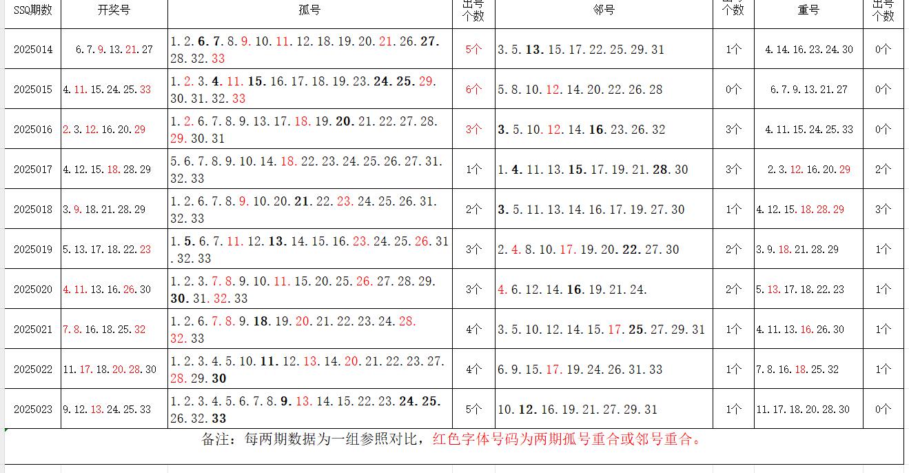 如图,以近两期数据为一组,进行对比分析。相同的孤号、邻号,可能在下期开出1-4个左右。上期孤号开出5个,邻号开出1个,重号0个。本期参考孤号:1.2.3.4.5.6.7.15.16.17.18.19.20.21.22.27.28.29.30.31;邻号:8.10.11.14.23.26.32。孤、邻号重合号码精选:***(会员专区可见)。个人分析,仅供参考。