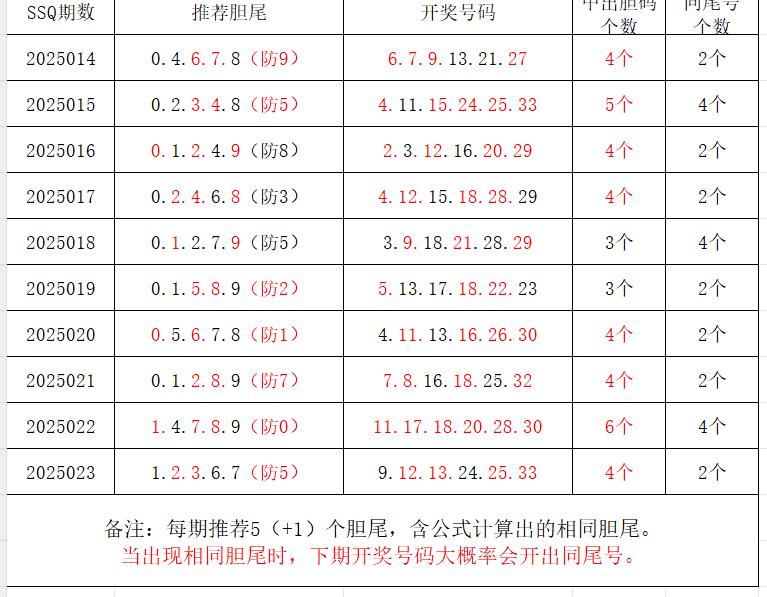 如图,每期推荐胆尾中出1-4个。上期推荐胆尾中出3尾4码!推荐胆尾是按照公式计算的顺序,不定位红球号码的顺序。本期推荐胆尾:6尾/9尾/1尾/5尾/3尾 。加推重点胆尾:***(会员专区可见)。推荐胆码号码:***(会员专区可见)。个人分析,仅供参考。