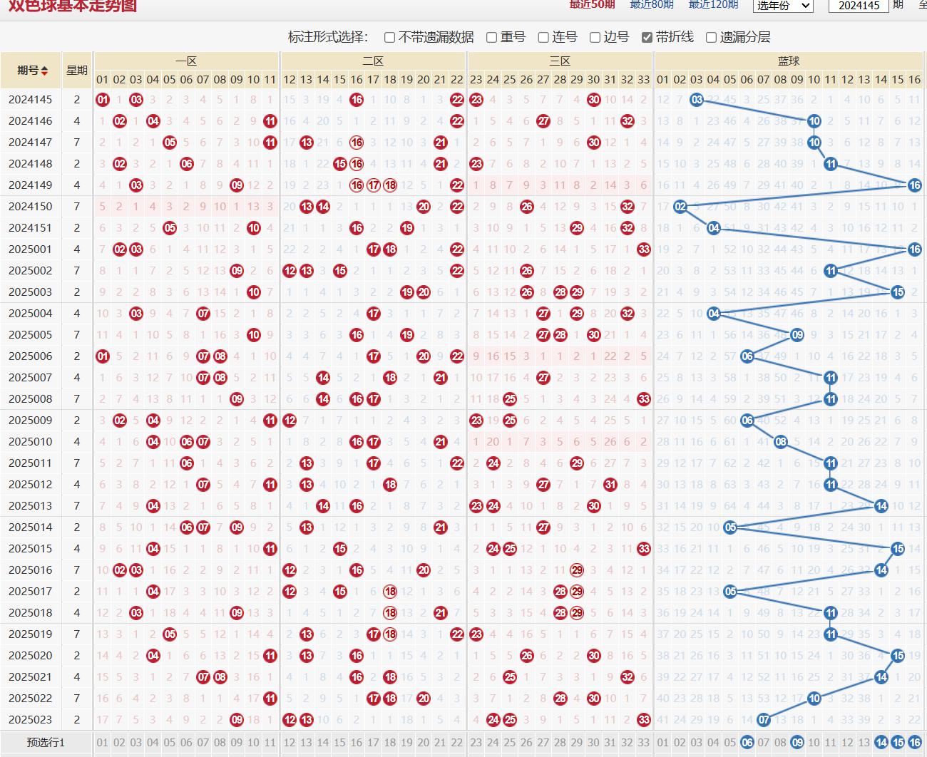 近19期红球区间分布呈现明显动态平衡,三区(23-33)持续高热,占比达29.8%;一区(01-11)占比29.8%,二区(12-22)占比40.4%。具体趋势特征: