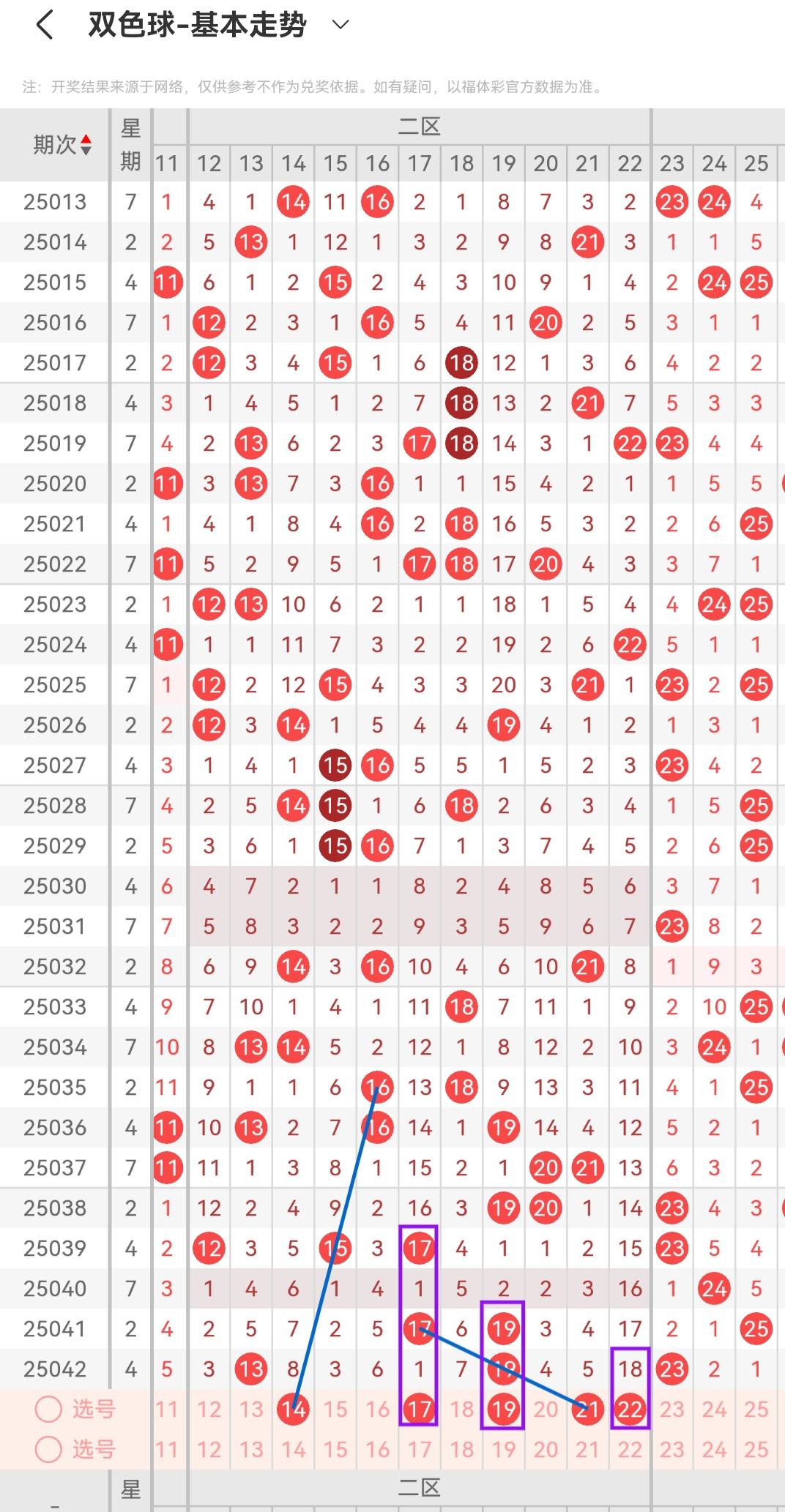 >二区间上期(25042期)开出了两码13-19,开出了独码和重号,本期做号需要注意重号能否继续开出,以及独码位置能否有落码和空白区域号码回补落码,从近期该区间上开出的独码来看,在25036期开出独码后下期独码放了空,在25039期开出独码后下期独码放了空,在25041期开出独码后下期独码一个放了空,另一个走了重,本期独码位置号码需要仔细研判考虑,从近期该区间上开出的重号来看,在25028期开出重号后下期重号走了重和分了边,在25029期开出重号后下期重号放了空,在25038期开出重号后下期重号放了空,本期重号位置号码需要仔细研判考虑,本期首先需要关注的号码【14】八期回补号码带隔空斜连走势,然后是【17】隔期回补号码带对称形态,其次是【19】三重号形态,【21】五期回补号码带隔空斜连走势,【22】十八期回补号码,本期重点关注号码【14 17 19 21 22】