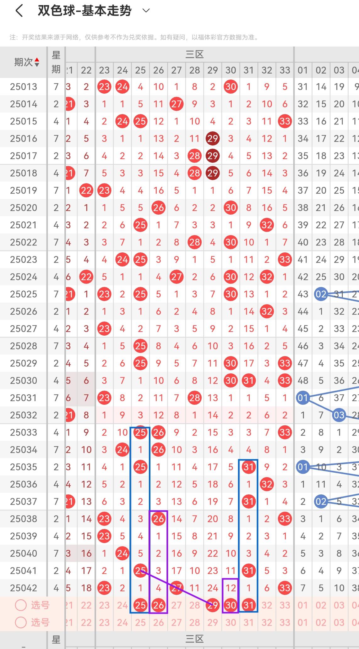 >三区间上期(25042期)开出了三码23-27-33,开出了独码,本期做号需要注意独码位置如何落码,以及空白区域号码回补落码,从近期该区间上开出的独码来看,在25035期开出独码后下期独码分了边,在25038期开出独码后下期独码一个走了重,另外两个放了空,在25041期开出独码后下期独码放了空,本期独码位置号码需要仔细研判考虑,本期首先需要关注的号码【25】隔期回补号码带对称形态,然后是【26】四期回补号码,其次是【29】隔空斜连走势号码,【30】十二期回补号码,【31】隔期回补号码带对称形态,本期重点关注号码【25 26 29 30 31】