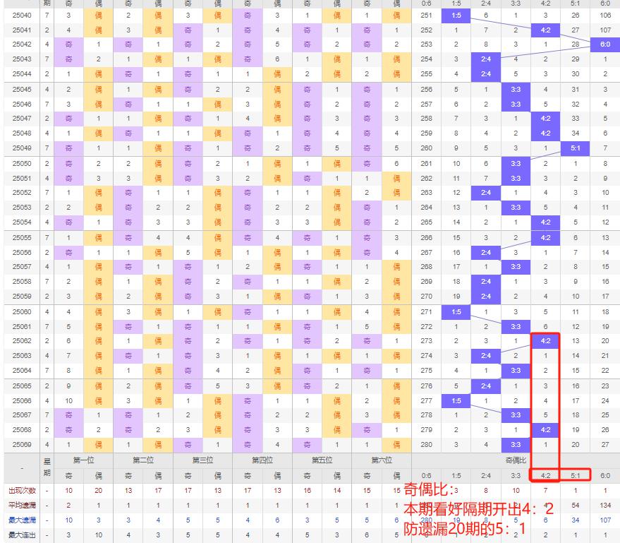 上期奇偶比:3:3,近10期奇偶比出现情况:1:5、3:3、4:2、2:4、3:3、2:4、1:5、3:3、4:2、3:3,最近10期出现4期3:3,出现2期4:2,出现3期2:4,出现0期5:1,出现2期1:5,出现0期6:0,出现0期0:6,根据近10期规律本期看好隔期开出4:2,防遗漏20期的5:1,综上所述推荐奇偶比推荐:5:1,重点关注:4:2。