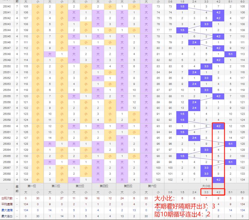 上期大小比:4:2,近10期大小比出现情况:4:2、1:5、2:4、5:1、3:3、1:5、5:1、3:3、3:3、4:2,最近10期出现4期3:3,出现2期4:2,出1期2:4,出现2期5:1,出现2期1:5,出现0期6:0,出现0期0:6,根据近10期规律本期看好隔期开出3:3,防10奇循环连出4:2,综上所述推荐大小比推荐:4:2,重点关注:3:3。