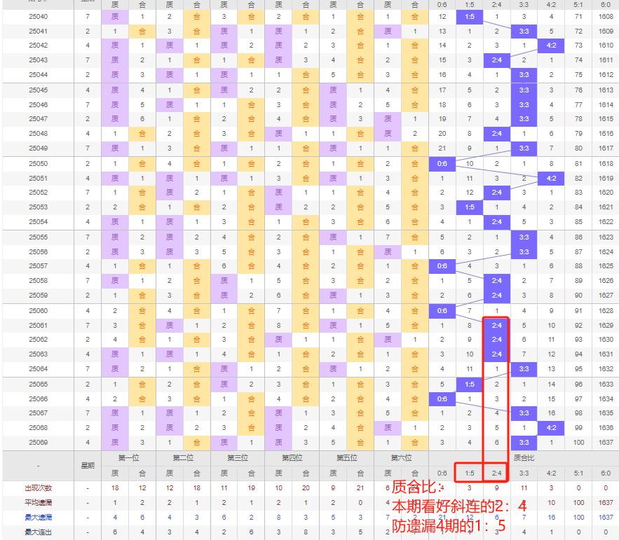 上期质合比:3:3,近10期质合比出现情况:0:6、2:4、2:4、2:4、3:3、1:5、0:6、3:3、4:2、3:3,最近10期出3期3:3,出现1期4:2,出现3期2:4,出现0期5:1,出现1期1:5,出现0期6:0,出现2期0:6,根据近10期规律本期看好斜连的2:4,防遗漏4期的1:5,综上所述推荐质合比推荐:1:5,重点关注:2:4。