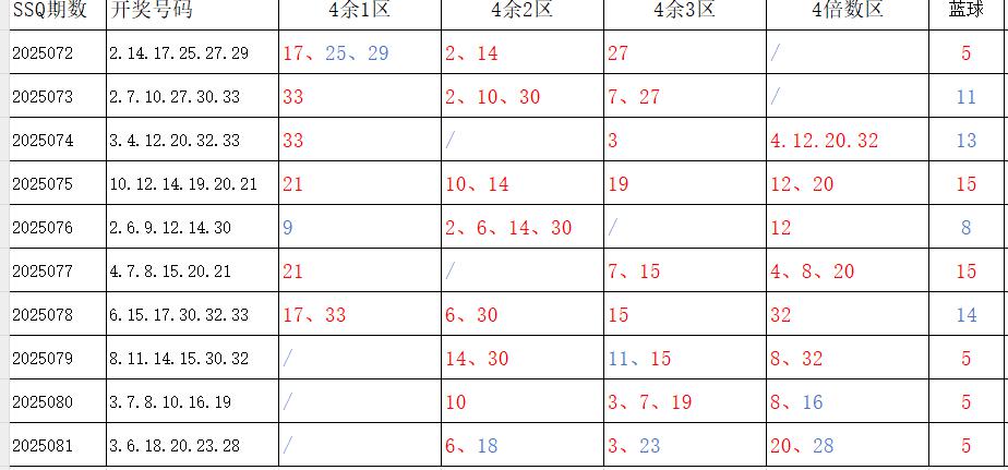 分享第一个数据分析:四分区统计数据。相对于传统的三分区,个人习惯使用四分区,就是把33个红球号码除以4,所得的余数分区如下: