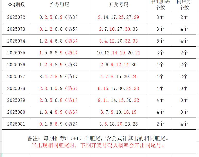 如图,每期推荐胆尾中出1-4个。上期推荐胆尾中出2尾2码!推荐胆尾是按照公式计算的顺序,不定位红球号码的顺序。本期推荐胆尾:8尾/3尾/2尾/6尾/7尾 。加推重点胆尾:***(会员专区可见)。推荐胆码号码:***(会员专区可见)。个人分析,仅供参考。