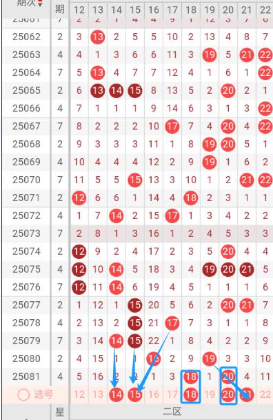 根据走势图可以看出当前区段,072期开出14.17二个号码球,073期没有开出号码球,074期开出了12.20二个号码球,075期开出了12.14.19.20.21五个号码球,076期开出了12.14二个号码球 ,077期开出了15.20.21三个号码球,078期开出了15.17二个号码球,079期开出了14.15二个号码球,080期开出了16.19二个号码球,081期开出了18.20二个号码球,按照如此规律本期当前区可能开出1单1双。我们看下当前区上期没有开出重叠号,那么本期当前区要定重叠号的情况下可关注18号码球。再看下当前区上期开出18.20斜连号,当期选号得留意斜连21号码球。本区重点关注14.15.18.20.21