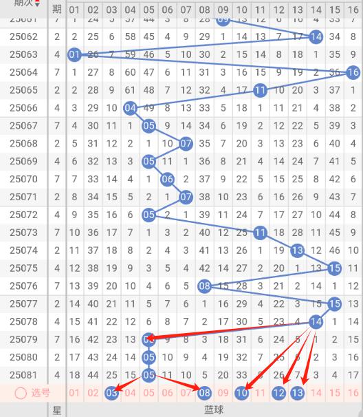 根据走势图近10期的走势看,蓝球在065期开出11蓝球之后,7小3大1小2大3小,再看下近10期的蓝球冷码有回补的趋势,这种趋势规律本期判断极有可能开出小号,本期防蓝球11大号,蓝球本期重点关注03,08,10,12,13