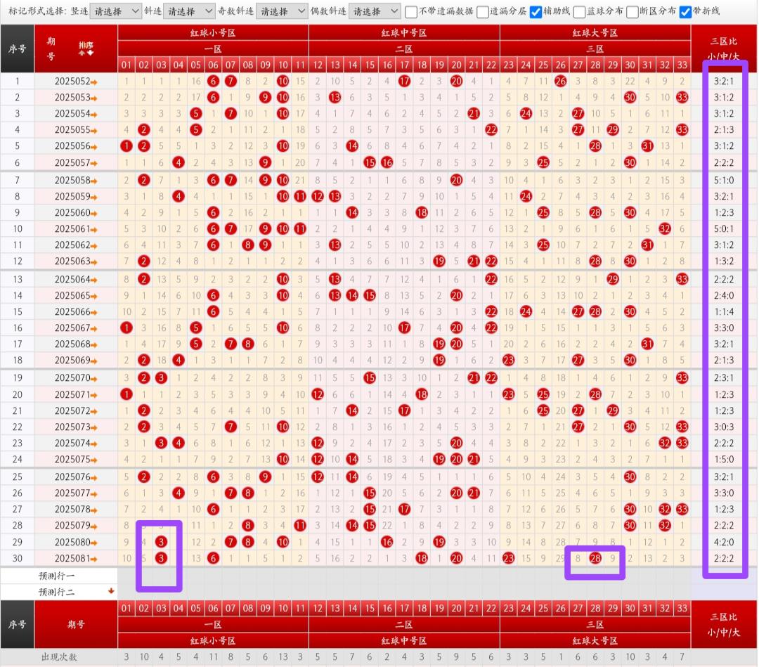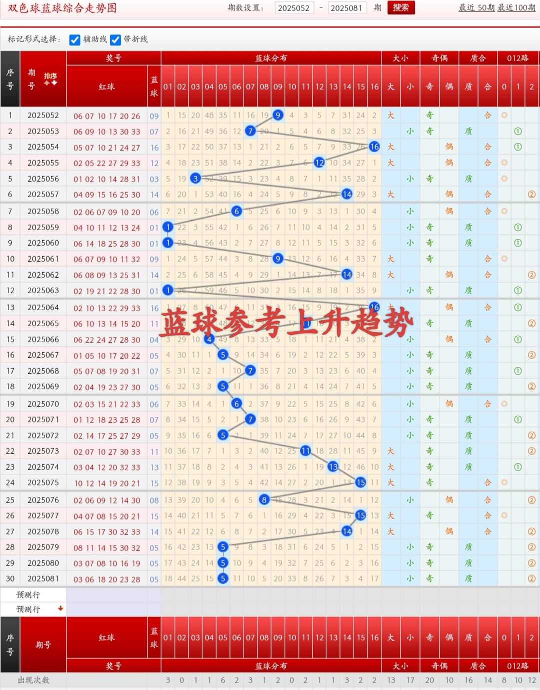 红球综合方面:一区为【01到11】,二区为【12到22】,三区为【23到33】,上期开出三区比为2:2:2,一区出号二个,二区出号二个,三区出号二个,最近几期一区和二区出号较多较热,本期需要注意一下一区和二区出号继续走热,通过最近七期数据二区出号个数比较多需要注意一下二区出号继续走热,综合最近30期数据分析此形态一共开出过四次,开出过次数较多较热,本期可断此形态,082期应该不会有断区出现,需要防一区和二区出号继续走热,上期龙头开出03为重复走势出号,龙头出号偏小,本期龙头需要注意防下降走势出号看好小数出号,上期凤尾开出28为上升走势出号,上期龙头和凤尾形成首尾跨度为25,本期需要注意凤尾上升趋势,本期重点关注一下凤尾3字头继续开出,本期需要注意龙头下降走势出号,凤尾上升趋势出号