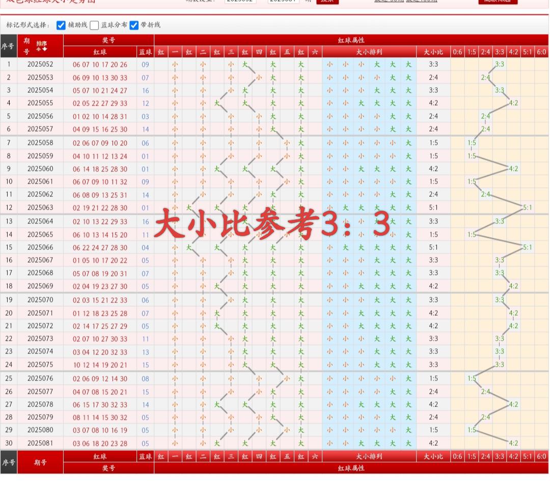 红球大小方面:小数为【01到16】,大数为【17到33】,上期开出大小形态为4:2,小数出号二个,大数出号四个,本期看好大数出号继续走热,综合最近30期数据分析形态0:6一次没有出现,形态1:5开出过六次,形态2:4开出过七次,形态3:3开出过九次,形态4:2开出过七次,形态5:1开出过二次,形态6:0一次没有出现,其中形态0:6,形态1:5,形态5:1,和形态0:6这四个形态开出过次数较少属于偏冷状态我们可以不用考虑太多以防为主还是以热形态为主,其中形态3:3开出过次数最多也是最热的需要注意一下,红球第一位小数出号30期以上本期继续看好小数出号,红球第二位小数出号十五期,本期这两个位置继续看好小数同出,大家需要多参考热的东西冷的东西不要去追,红球第六位大数出号已经30期以上本期继续看好大数,第五位上期大数出号本期继续看好大数出号回补,本期第五位和第六位继续看好大数同出,上期第四位开出大数出号,本期注意这三个位置继续大数出号,本期要想判断它的大小形态需要通过第三位去看,082期大小方面参考形态3:3